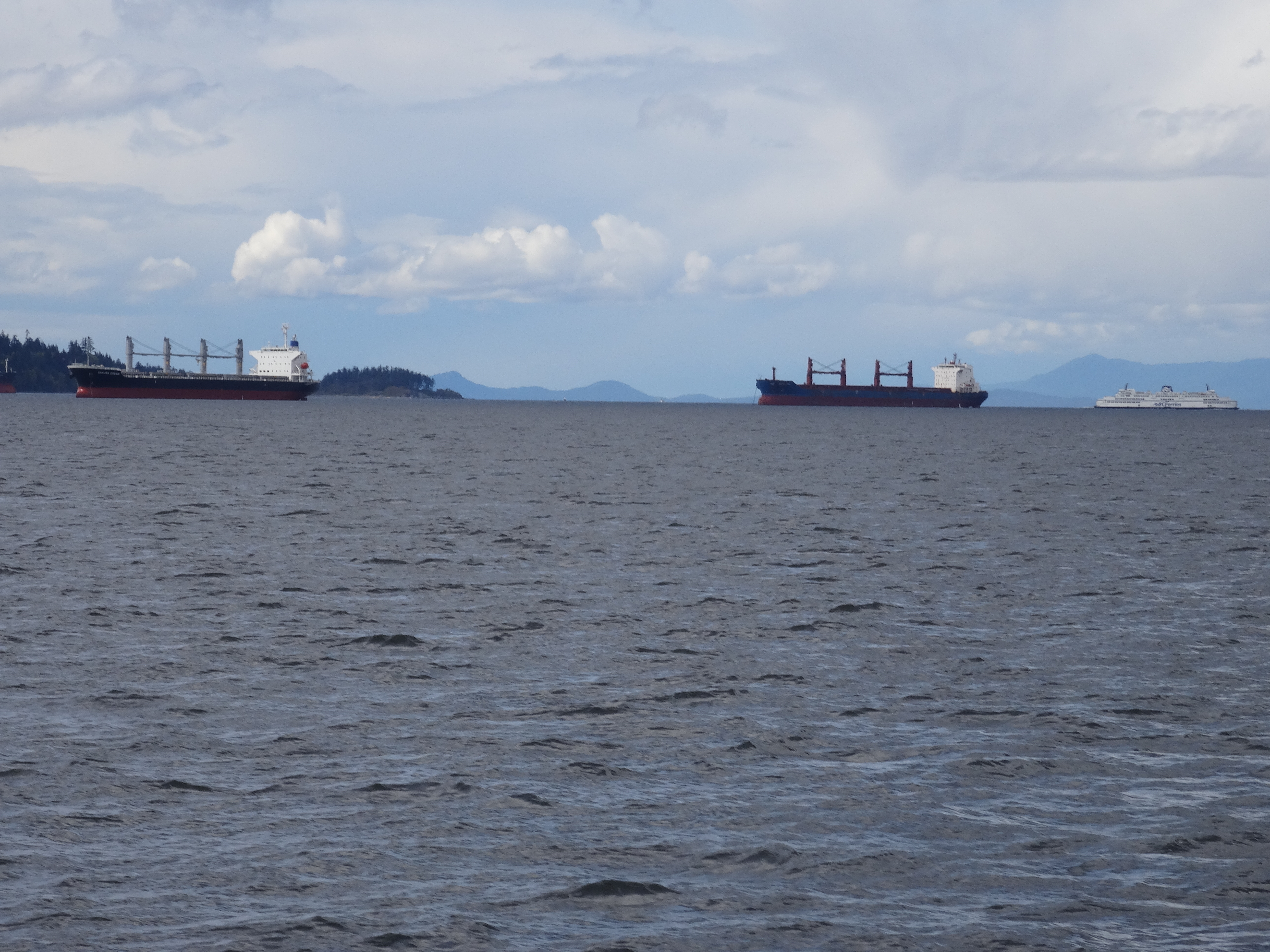 Freighters anchor off Nanaimo waiting to load their holds full of our natural resources like logs, coal, pulp and paper from the port of Vancouver 36 kilometres away. Can you see another B.C. Ferry in the background? There are two ferry terminals based in Nanaimo that sail to Vancouver.