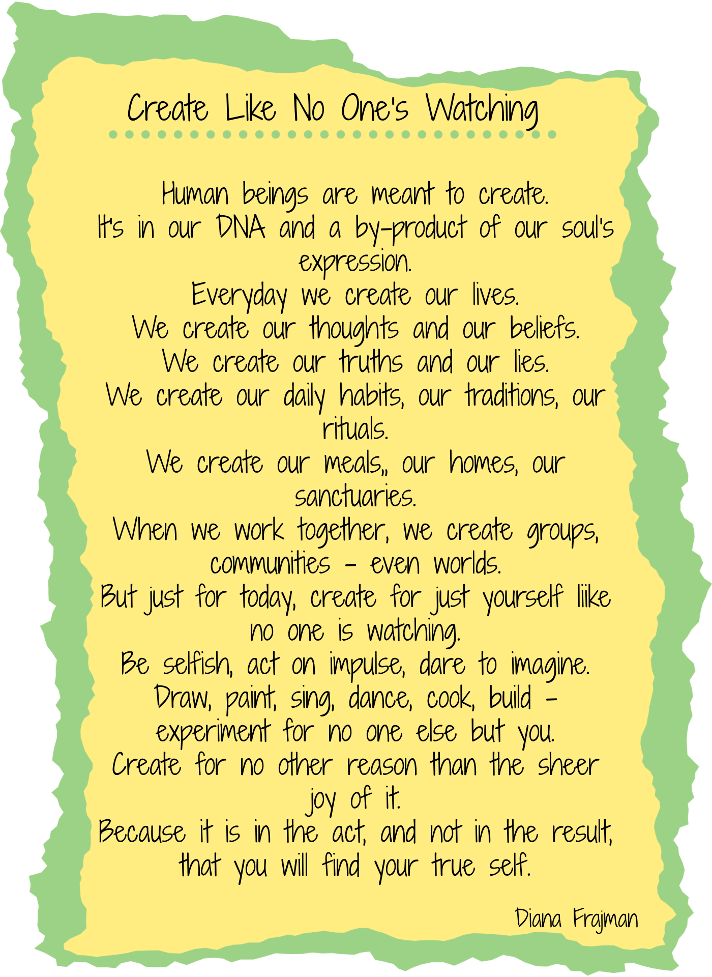 Now I’m not delusional. I knew that my art was not going to be very good to start. That was never the point, only the act of creating. I yearned for that totally freeing, in the zone, space where time stands still and flies both at the same time. When you unclip the leash of expectation on your imagination and let it out to play.